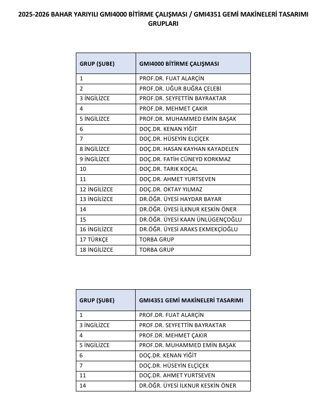 2025-2026 Bahar Dönemi Bitirme Çalışması ve Proje Grupları