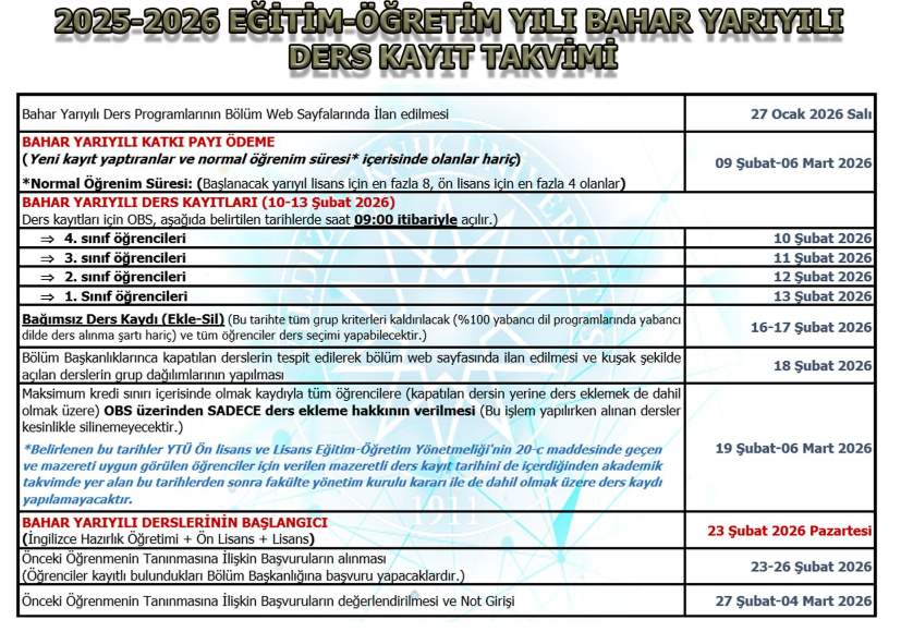 2025-2026 Eğitim-Öğretim yılı Bahar yarıyılı ders kayıt işlemleri 10-13 Şubat 2026 tarihlerinde gerçekleştirilecektir. Ders kayıt takvimi ve Ders Kayıt Kılavuzları sayfada belirtilmiş olup, YTÜ Lisans Akademik Takvimi için buraya tıklayınız.
