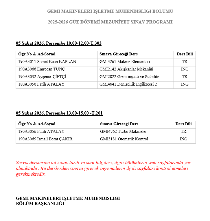 2025-2026 GÜZ DÖNEMİ MEZUNİYET SINAV PROGRAMI