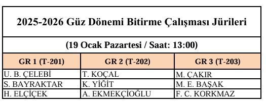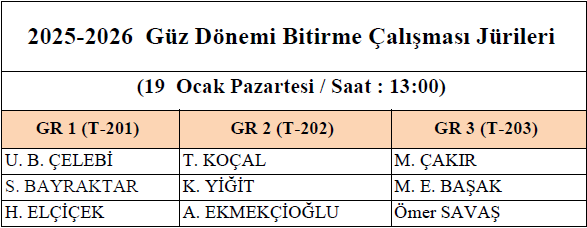 Ayrıca, öğrencilerimizin hazırlayacakları bitirme tezine ait poster sunumları zorunlu olup, basılı halini 14.01.2026 Çarşamba gününe kadar Bölüm Başkanlığına teslim etmeleri gerekmektedir.